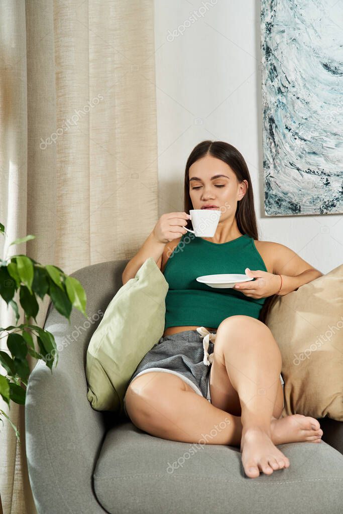 Молодая женщина с брюнетками расслабляется дома, неторопливо потягивая чай на уютном диване, наполненном комфортом и теплом.
