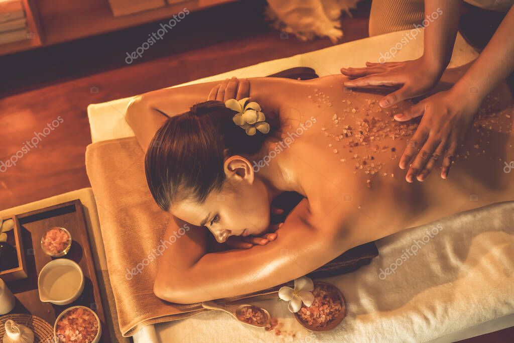 Женщина-клиент, проводящая пилинг в роскошном спа-салоне с теплым свечой окружающей среды. Косметическое лечение бальзамическим скрабом в Health spa scrub. Quiescent