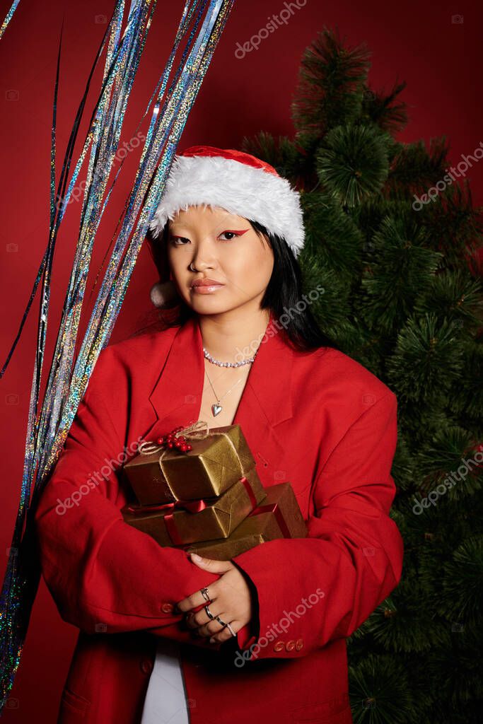 ОГНИ ЦВЕТА ЯРКИЕ ЮВЕЛИРНЫЕ ИЗДЕЛИЯ КРАСИВАЯ ПРАЗДНИК РОЖДЕСТВО ЭЛЕГАНТНОСТЬ СТОРОНА КРАСОТА РАДОСТЬ ВЕСЕЛЫЕ ПОРТРЕТ ОТНОШЕНИЕ ЗИМА ПОДАРКИ В ПОМЕЩЕНИИ УЮТНЫЙ СТИЛЬНЫЙ ГЛАМУР ТРАДИЦИЯ ЖЕНЩИНА ТЕПЛО ДЕКОРАЦИИ АКСЕССУАРЫ ФАНАН ПРИВЕТ НАРЯД ДАВАТЬ ШАРМ УЛЫБАЕТСЯ ВОЛНЕНИЕ ШЛЯПА САНТЫ ДУХ ПРАЗДНИКА ЗИМНЯЯ МОДА АЗИАТКА ПРАЗДНИЧНЫЙ СЕЗОН ПРАЗДНИЧНОЕ ОФОРМЛЕНИЕ ЗАВЕРНУТЫЕ ПОДАРКИ СЕЗОННАЯ МОДА КРАСНЫЙ БЛЕЙЗЕР ФОН ДЕРЕВА СТИЛЬНЫЙ НАРЯД