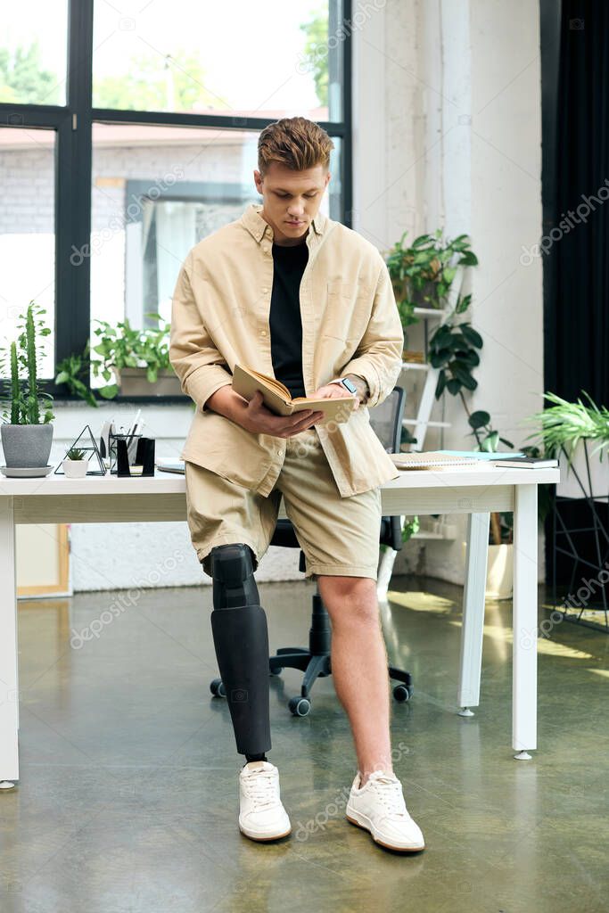 - Молодой человек с протезной ногой сосредоточен на чтении книги в стильной современной офисной обстановке.