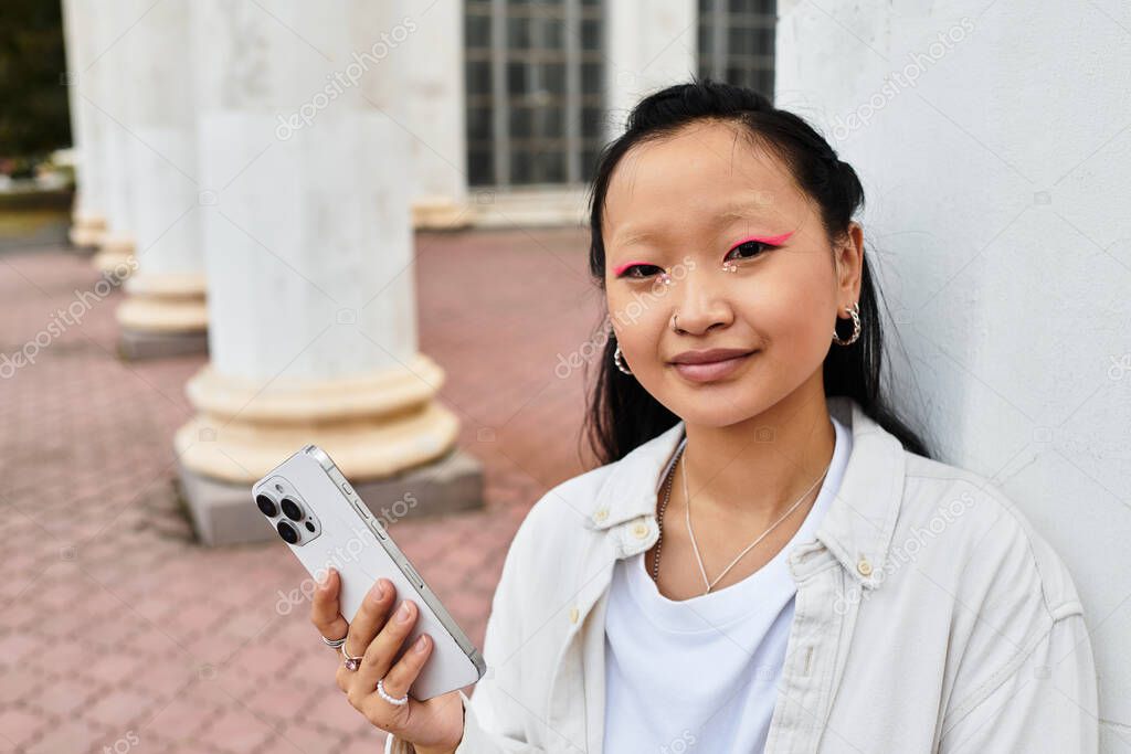 - Стильная студентка уверенно стоит с телефоном, обнимая молодежную культуру за пределами университетского городка.