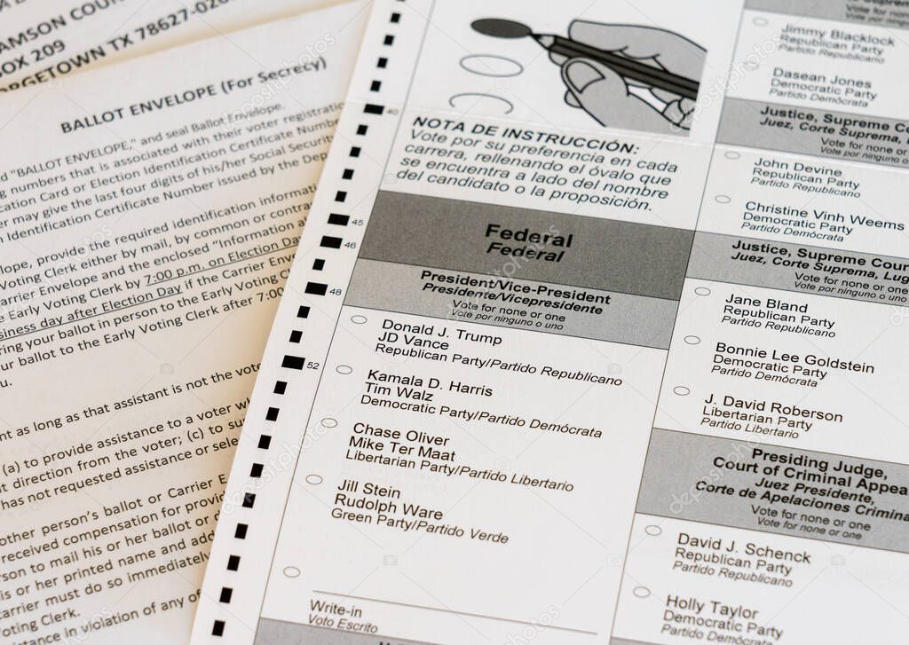 БУМАГА СТОРОНА ФОРМА РУКА ФЕЛИКС НАС США ВЫБОР ТЕХАС СЕЛЕКЦИЯ ПОЧТА ФЕЛИПЕ ПОЛИТИЧЕСКИЕ БУМАЖНАЯ РАБОТА ДЕМОКРАТИЯ ОФИЦИАЛЬНЫЙ ДЕМОКРАТ ГОЛОСОВАНИЕ ПОСТАЛ КАНДИДАТ ПРЕЗИДЕНТ ВЫБОРЫ ДЕМОКРАТЫ БЮЛЛЕТЕНЬ ИЗБРАТЬ ПРЕЗИДЕНТСКИЙ ТРЮМП ДЖОРДЖТАУН ОТСУТСТВИЕ ЗАОЧНОЕ ВЭНС WALZ ТРАМП 2024 ГОД ХАРРИС КАМАЛА УИЛЬЯМСОН РАННЕЕ ГОЛОСОВАНИЕ ПОЧТОВОЕ ГОЛОСОВАНИЕ ФОРМА ИЗБИРАТЕЛЯ ЗАОЧНОЕ ГОЛОСОВАНИЕ ГОЛОСОВАЛИ ПО ПОЧТЕ ПОЧТОЙ В БЮЛЛЕТЕНЕ