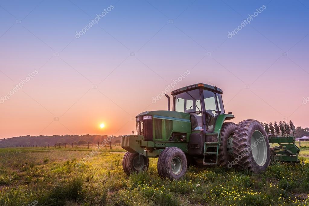 Фермерский трактор в поле на ферме Мэриленд на закате