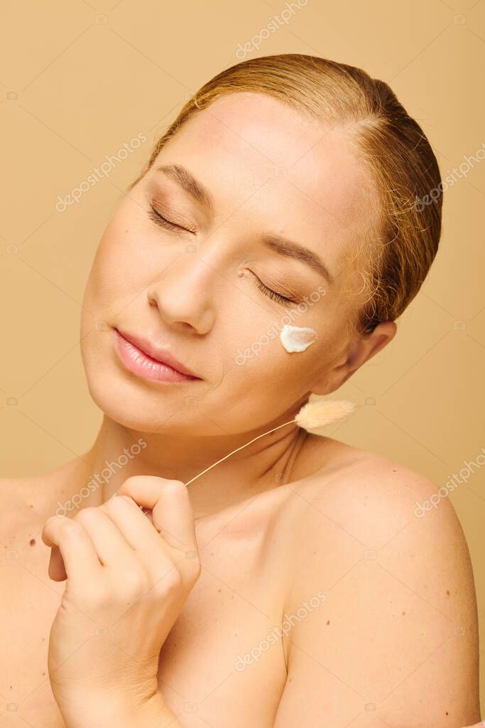 - Молодая красивая женщина плюс размер расслабляет при нанесении крема на лицо, наслаждаясь уходом за собой.