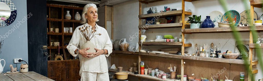 - Опытная женщина изящно стоит в своей мастерской керамики, окруженная инструментами и искусством..