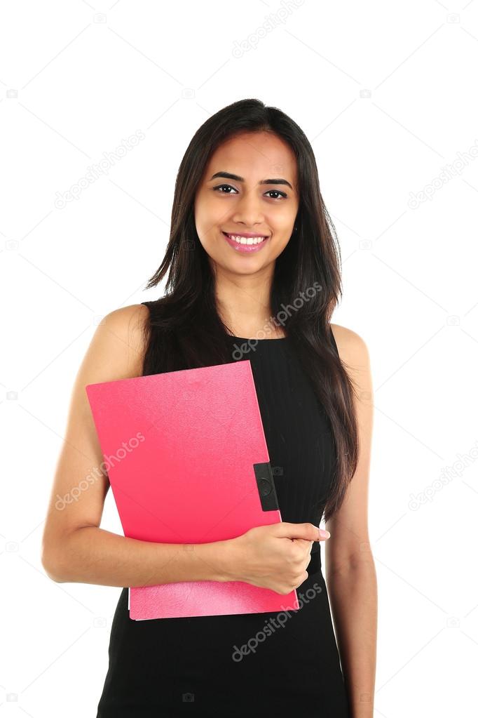 Закрыть портрет улыбающейся индийской деловой женщины с папкой. изолированные на белом