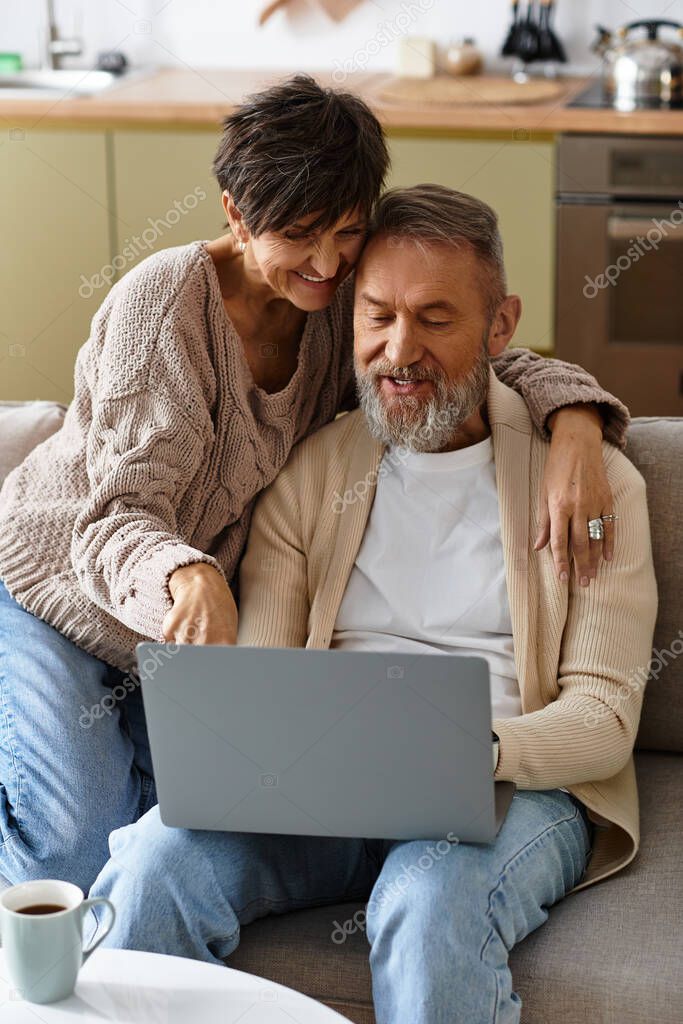 Счастливая пожилая пара делится смехом и любовью во время просмотра в Интернете со своего уютного дивана.