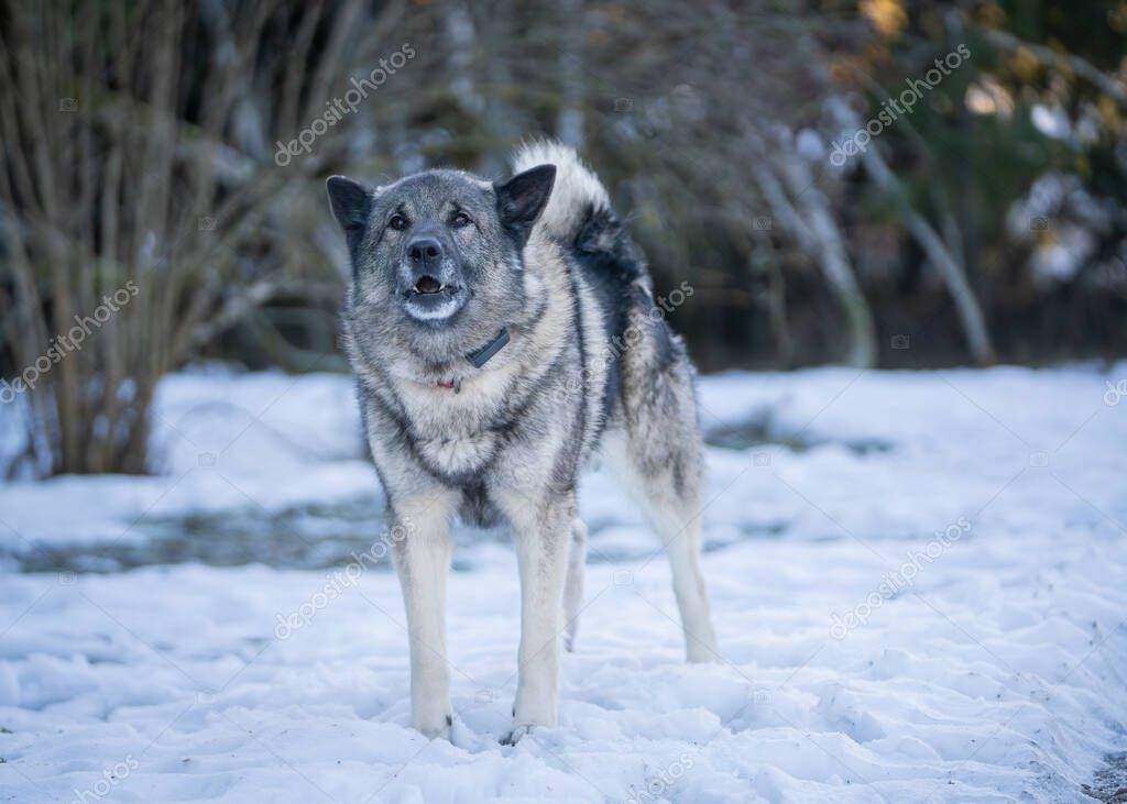 - Норвежский эльхаунд охраняет дом в зимний день. Элкхоунд служил шлюхой, гвардейцем, оленеводом и защитником.