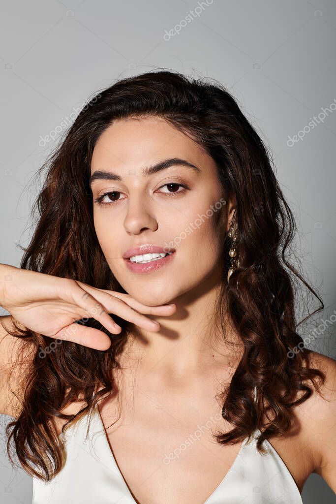 - Очаровательная молодая женщина демонстрирует свою красоту с теплой улыбкой на нейтральном фоне.