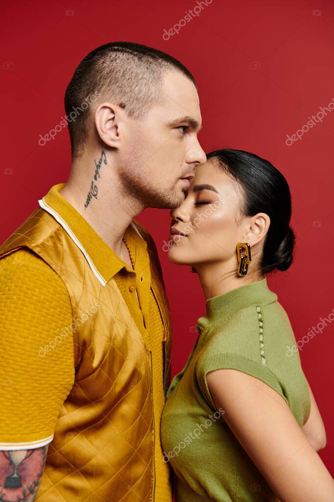 - Красивая молодая пара позирует близко друг к другу, отмечая романтику в студии.