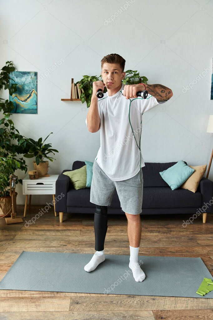 - Красивый молодой человек занимается тренировкой дома, демонстрируя решимость и силу.