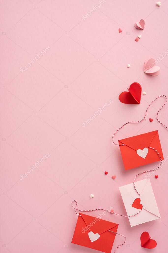 - Красно-белые вертикальные конверты с вырезанными сердцами на розовом фоне, символизирующие любовь и привязанность. Идеально подходит ко Дню святого Валентина