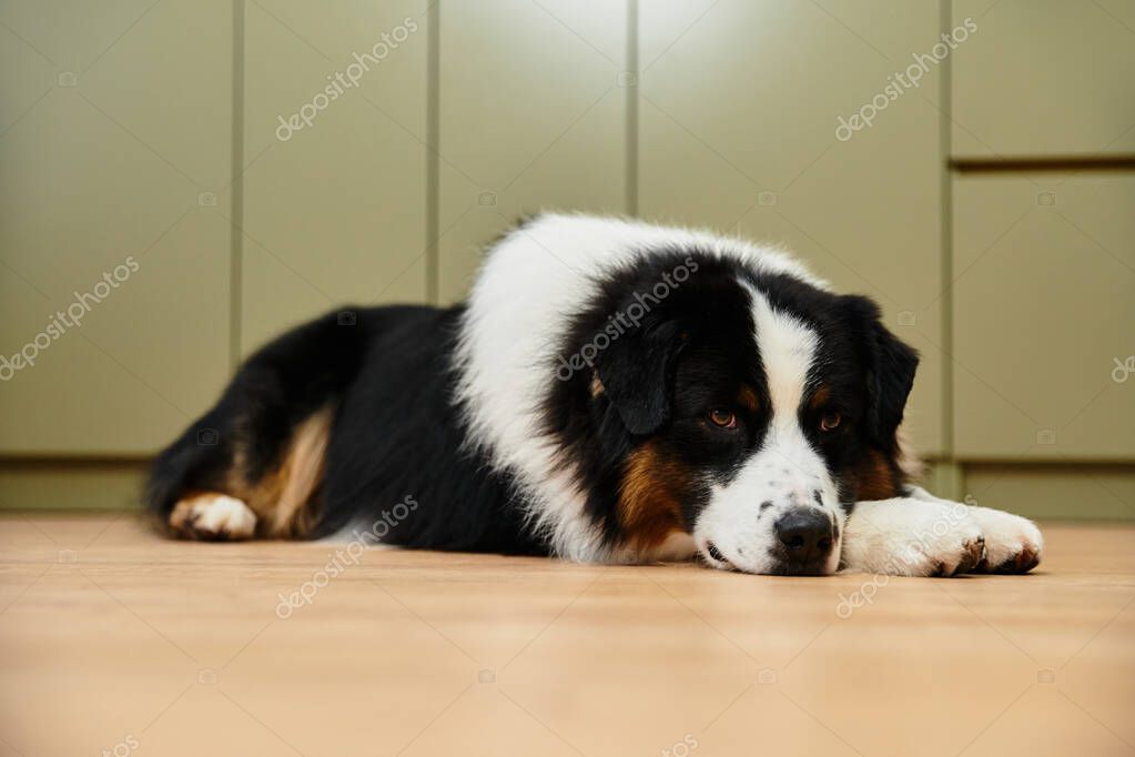 - Уставший австралийский Шид отдыхает на гладких лиственных полах в современной квартире