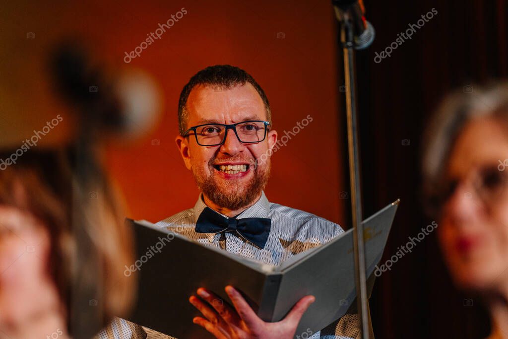 Валмиера, Латвия - 8 февраля 2025 года - Улыбающийся певец хора в очках и галстуке-бабочке держит на сцене песенник под теплым освещением, создавая радостную атмосферу вечеринки 90-х годов