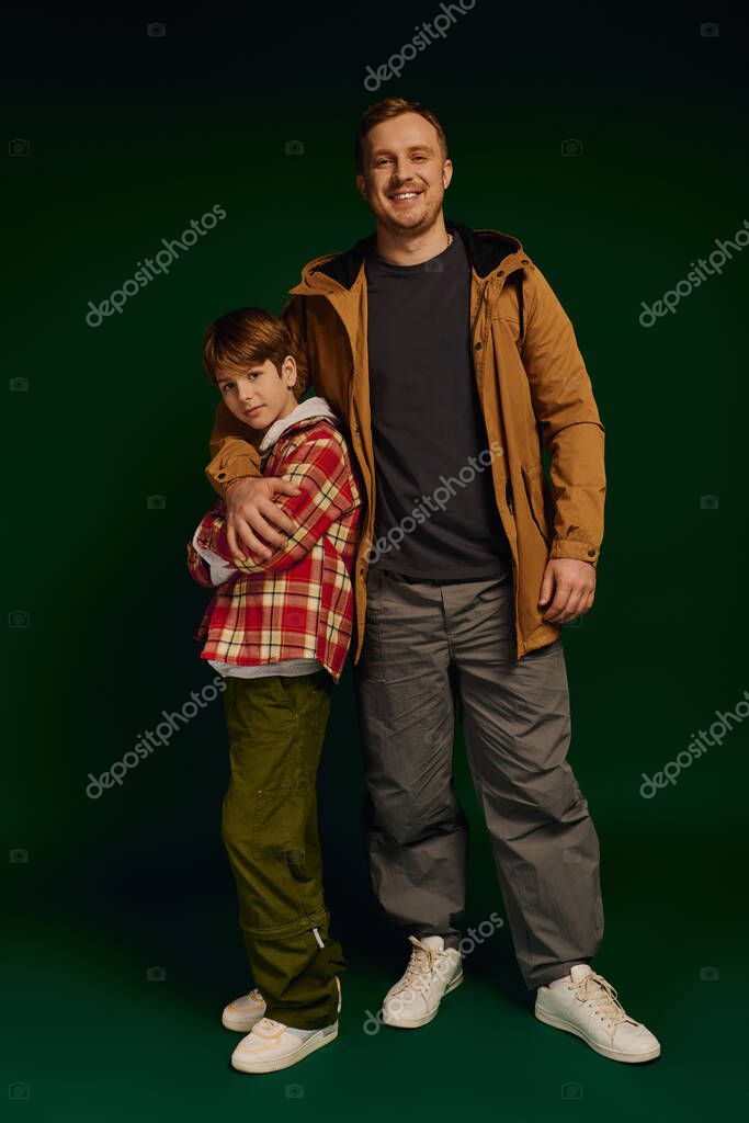 - Отец и сын демонстрируют свою жизнерадостную связь, надевая повседневные наряды в студии..
