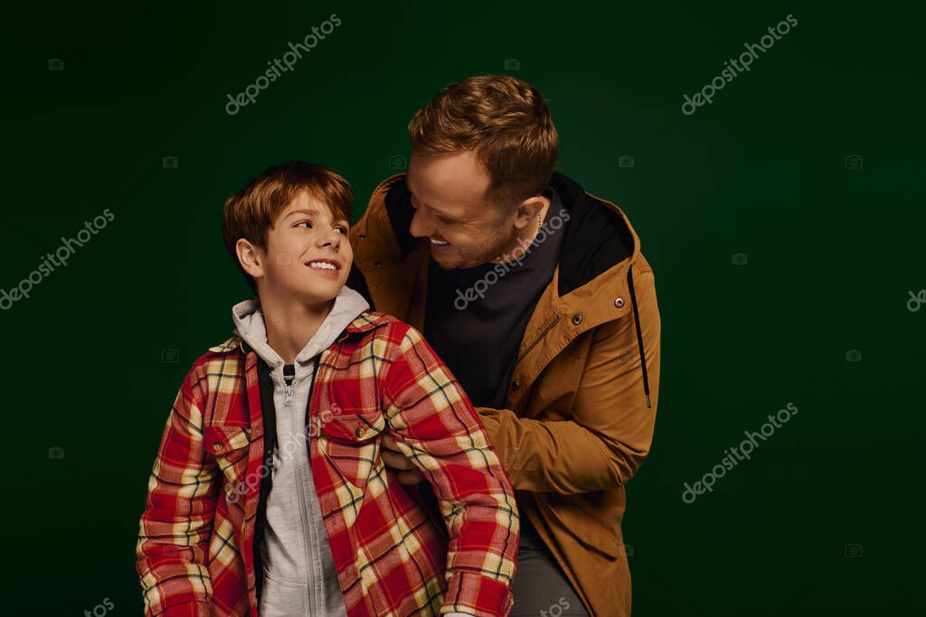 Отец и сын делятся радостными улыбками, одеваясь в стильные повседневные наряды во время студийной сессии.