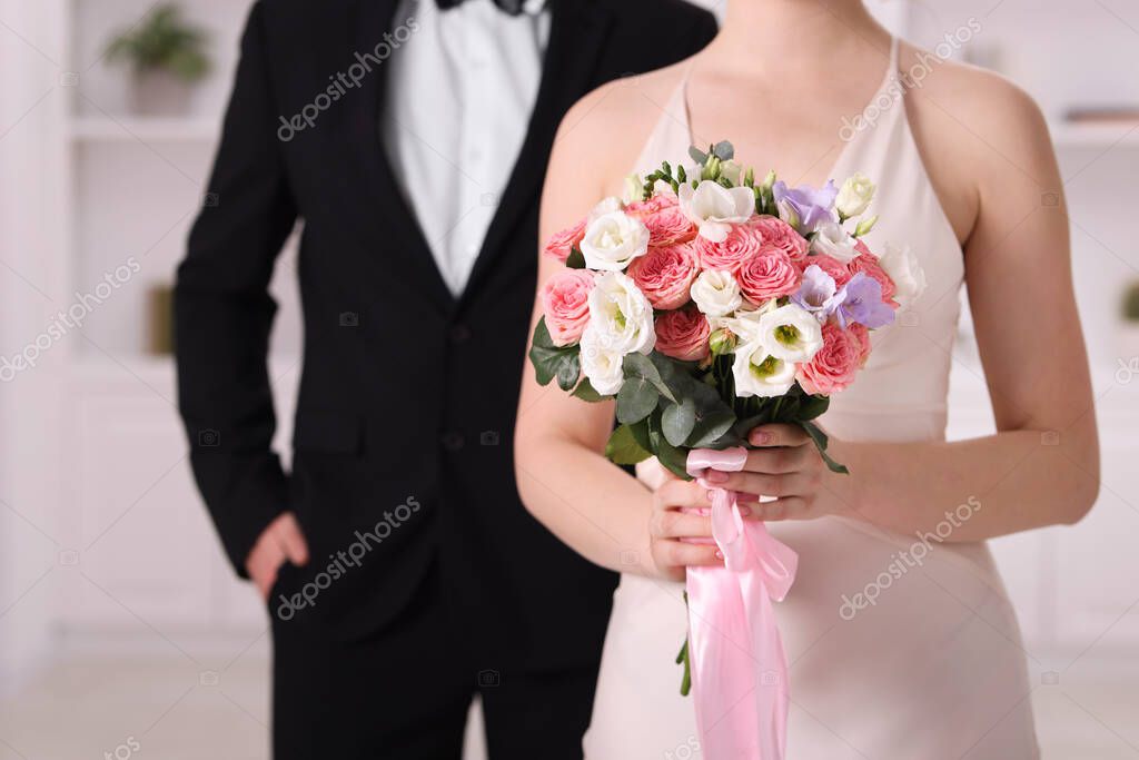 Невеста с красивым свадебным букетом и женихом в помещении, крупным планом