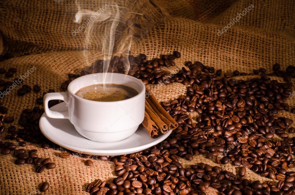 - Белая чашка кофе и кофейные зерна вокруг