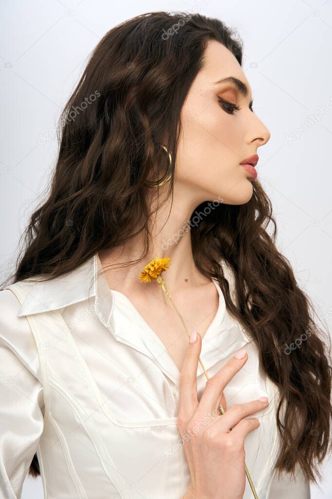 - Молодая женщина с каштановыми волосами восхищается цветком, излучая красоту в весенней обстановке.