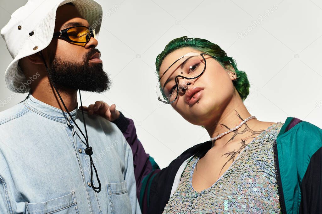 Модная мультикультурная пара уверенно позирует в студии в модных солнцезащитных очках.
