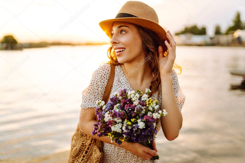 Молодая женщина смеется с букетом диких цветов на закате. Цветочный турист наслаждается морской пейзаж с букет цветов на открытом воздухе. Концепция наслаждения и расслабления.