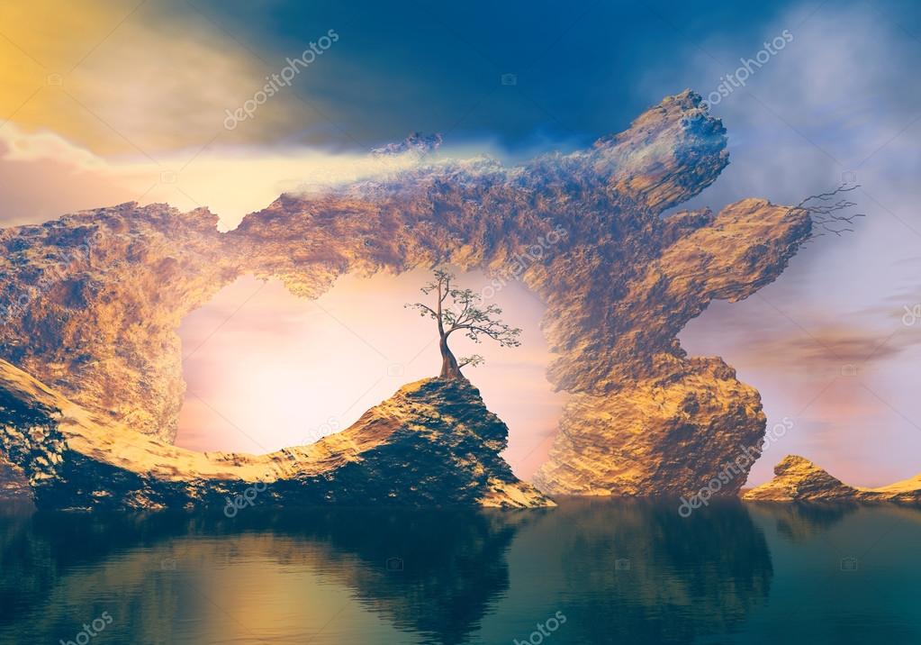 3D иллюстрация сюрреалистического ландшафта с двумя большими скалами и деревом, которое отражается в воде и цветном небе