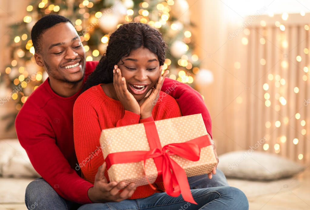Рождество или новогоднее утро и подарки. Удивлённая молодая африканская американка радуется присутствию в коробке с лентой от мужа в интерьере гостиной с елкой и гирляндами, свободному пространству