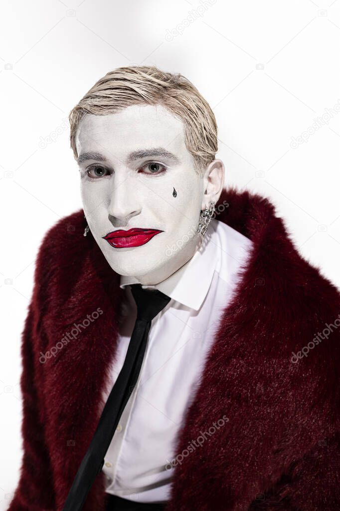 Молодой человек поражает игривым костюмом Джокера на Хэллоуин.
