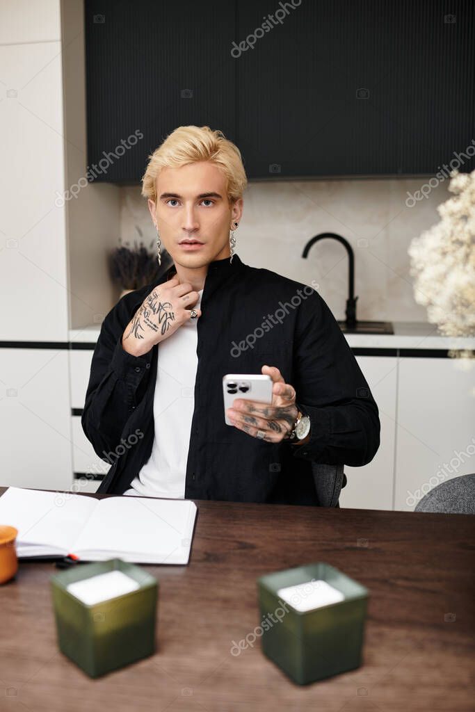 Красивый молодой человек в гладкой квартире проверяет свой смартфон, сидя за деревянным столом.