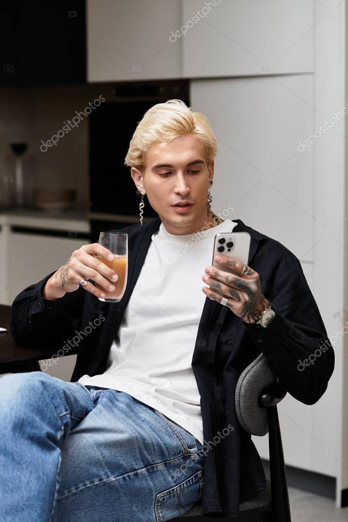 Стильный молодой человек удобно сидит в шикарной квартире, потягивая напиток и пользуясь телефоном.
