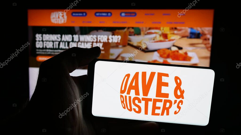 - Штутгарт, Германия - 10-13-2025: Лицо, держащее мобильный телефон с логотипом компании Dave and Buster 's Entertainment Inc. на экране перед веб-страницей. Фокус на дисплее телефона.