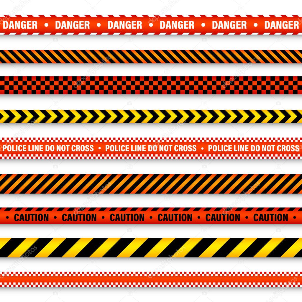 - Баррикадная строительная лента. Красочная полицейская линия предупреждения, ярко окрашенная опасность или полоса опасности, лента. Запретная зона, зона. Символ внимания Векторная иллюстрация.