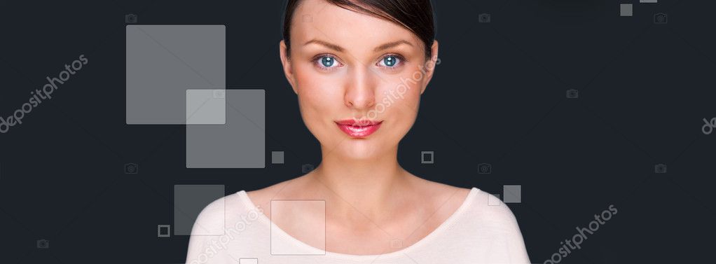 Портрет молодой красивой женщины, стоящей на сером фоне и смотрящей в камеру. Пустые квадратные кнопки плавают вокруг нее