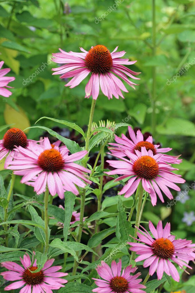 Фиолетовый шиповник, пурпурная инацеа, сорт Rubinstern, цветки крупным планом на размытом фоне листьев.