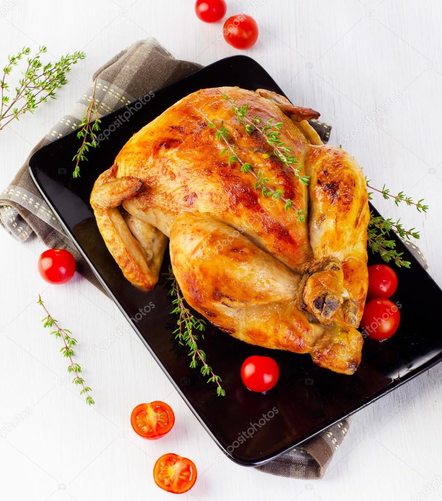 Целый жареный цыпленок с овощами на черной тарелке