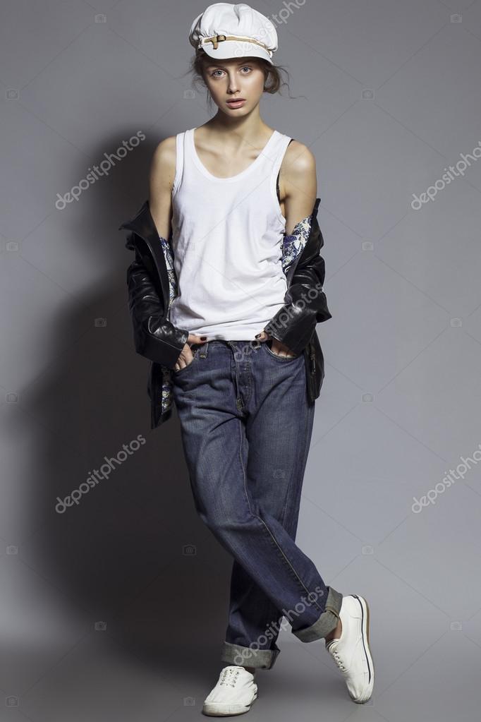 Высокая мода. Портрет модной модели с натуральным макияжем и идеальной кожей, одетый в мужские джинсы, белую рубашку, черную куртку, стильную белую шляпу и кроссовки. Снимок студии
