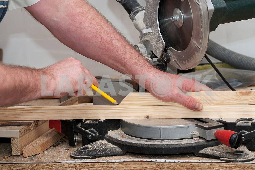 - Описание: Carpenter tools on wooden table with sawdust. Circular Saw. Copy space.